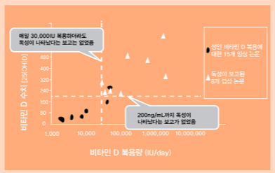 "비타민 D의 과잉섭취로 인한 중독증상 발생에 영향을 미치는 요인은 다양하며, 독성 증상을 유발하는 비타민 D의 섭취량 또한 아직까지 불분명하다. DeLuca 등은 고칼슘혈증 등의 독성은 하루 25,000IU 이상의 비타민 D 섭취 시, 즉 혈중 비타민 D 농도가 200ng/mL인 경우에 발생한다고 보고하였다. Hathcock 등은 20여 편의 연구결과를 종합한 결과 하루 10,000 IU 이하의 비타민 D의 섭취는 부작용의 발생과 관련성이 없다고 보고하였다. 대부분의 연구에서 비타민 D의 독성이 나타나는 역치를 하루 10,000-40,000 IU 사이로 보고하고 있다. 또한 혈중 비타민 D 농도 200~240ng/mL 이하에서는 독성 작용의 보고가 없으며, 실제 독성 작용과의 관련성은 혈중 비타민 D 농도 300ng/mL 이상에서 보고되었다" <2020 한국인 영양소 섭취 기준 중에서>
