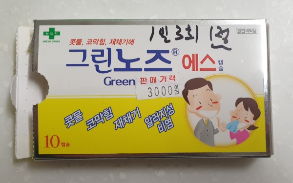 그래서 알게 된 그린노즈 에스 캡슐은 알레르기성 비염 또는 콧물, 코막힘, 재채기, 인후통 등의 증상이 생겼을 때 복용하는 비염약입니다. 10여 년간 비염으로 고생하면서 비염약들을 여러 가지 먹어보았는데요. 지금까지 먹어본 비염약들 중에서는 효과가 가장 빠른 느낌을 받았습니다. 하루 1회 복용하는 약들에 비해 하루 3회 복용이라 확실히 빠른 효과를 자랑하지만 약간의 부작용으로 코와 입이 건조하거나 졸릴 수 있다는 점입니다.
