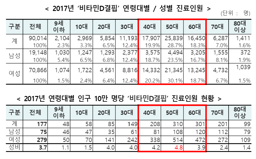 지난 2019년 2월 국민건강보험공단에서 건강보험데이터를 활용해 2013~2017년 비타민D 결핍증 환자를 분석한 결과 50대에서 가장 많고 40대와 60대 순으로 많았습니다. 40~60대 중장년층이 전체 환자의 2/3를 차지할 정도입니다. 특히 여성이 남성보다 3.7배 많았는데요. 비타민D 정상 농도 30을 기준으로 분석했더니 여성의 85%가 부족으로 나왔다고 합니다. 한국 여성 10명 중 8명은 잠재적인 비타민D 결핍증 환자라는 얘기입니다.